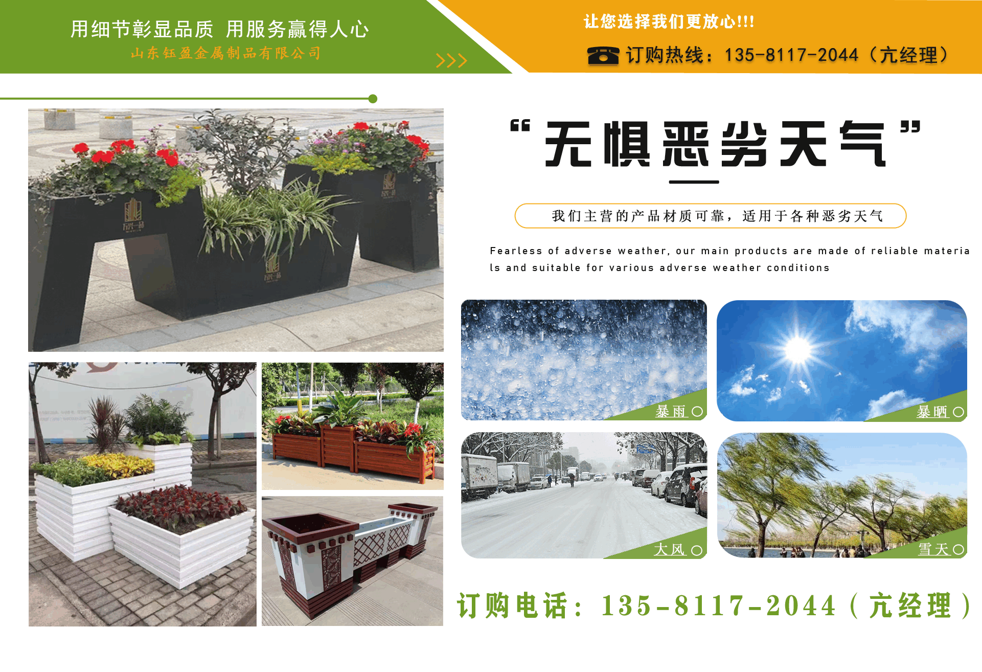 山東鈺盈金屬制品有限公司主營(yíng)鍍鋅板花箱,道路隔斷花箱,定制花箱,戶外道路花箱,花箱座椅等產(chǎn)品,產(chǎn)品結(jié)構(gòu)合理、性能優(yōu)良,具有強(qiáng)度高、耐腐蝕、抗老化、隔熱隔音、節(jié)約能源、外形美觀、使用壽命長(zhǎng)等優(yōu)點(diǎn),深受?chē)?guó)內(nèi)外客戶認(rèn)可。 我們根據(jù)客戶所在城市的文化特征,制造出符合當(dāng)?shù)爻鞘形幕瘹庀⒌淖匀涣Ⅲw、觀賞性強(qiáng)的花箱產(chǎn)品成為城市里一道靚麗的風(fēng)景線。 公司實(shí)行誠(chéng)實(shí)、公正、守信、價(jià)格合理、平等互利。 公司憑借雄厚經(jīng)驗(yàn)實(shí)力,恪守誠(chéng)信為本的原則,得到了眾多客戶的信賴(lài),并在業(yè)界獲得良好的口碑。建立了穩(wěn)固的合作關(guān)系,隨著業(yè)務(wù)的不斷發(fā)展和壯大,合作伙伴的范圍也在不斷擴(kuò)大。我們熱情盼望與您的合作,為社會(huì)的可持續(xù)發(fā)展獻(xiàn)上一份努力。...